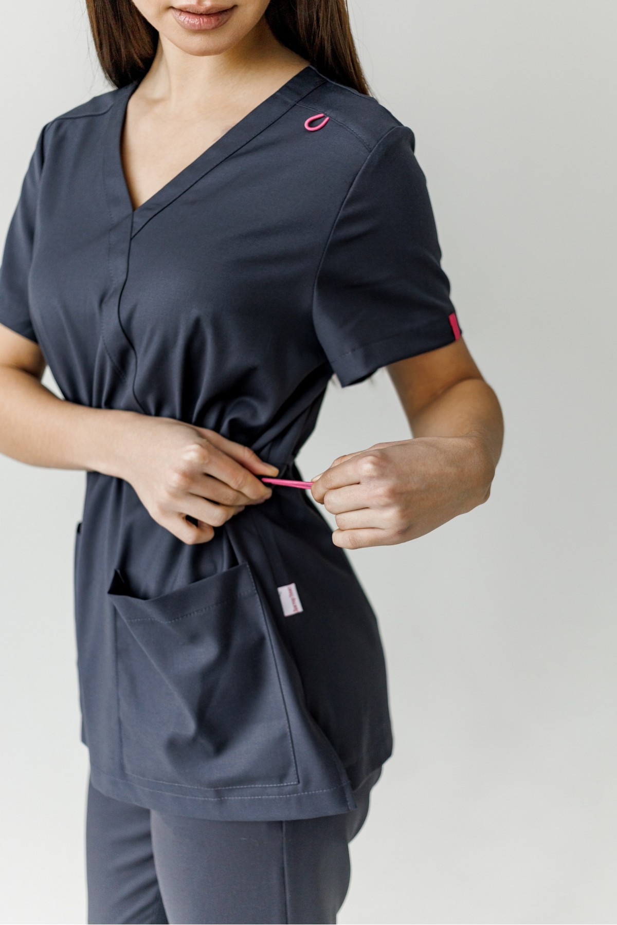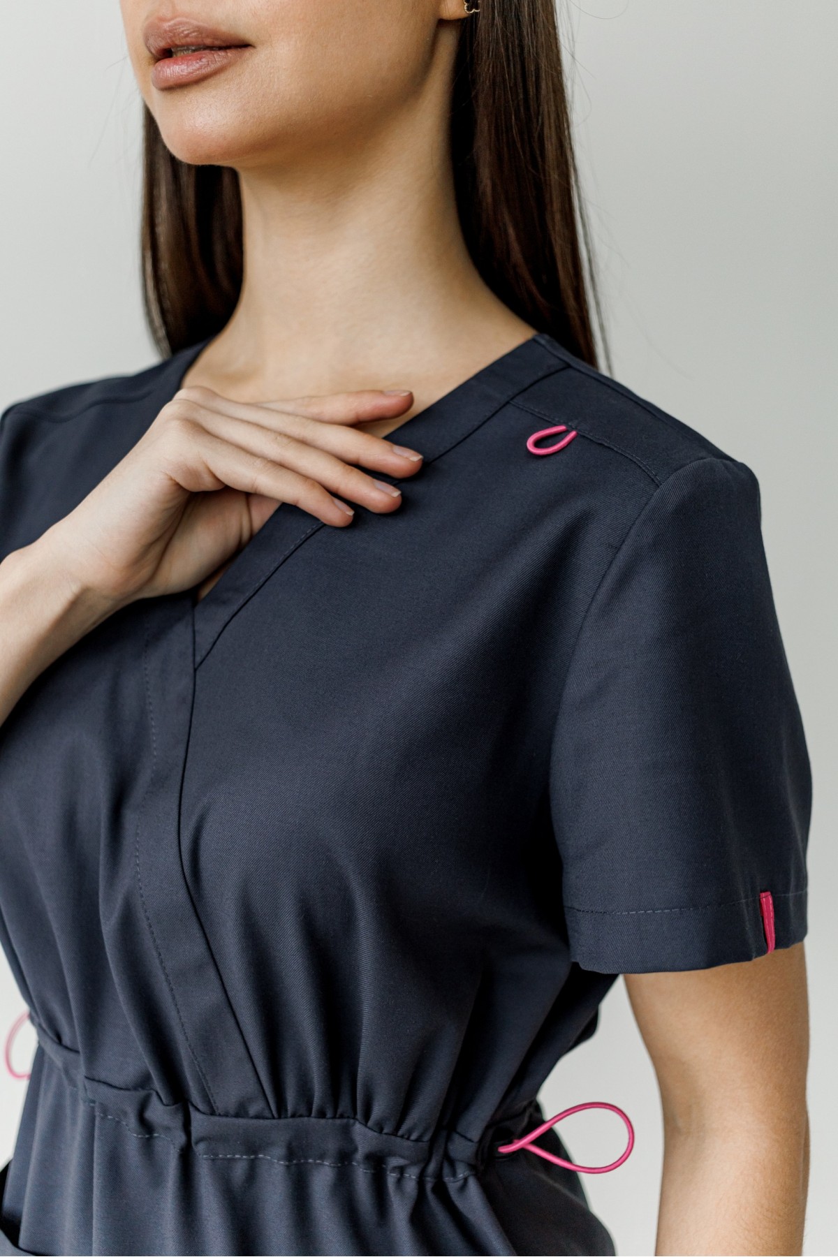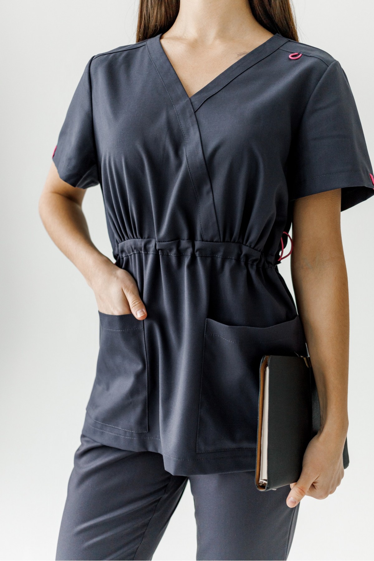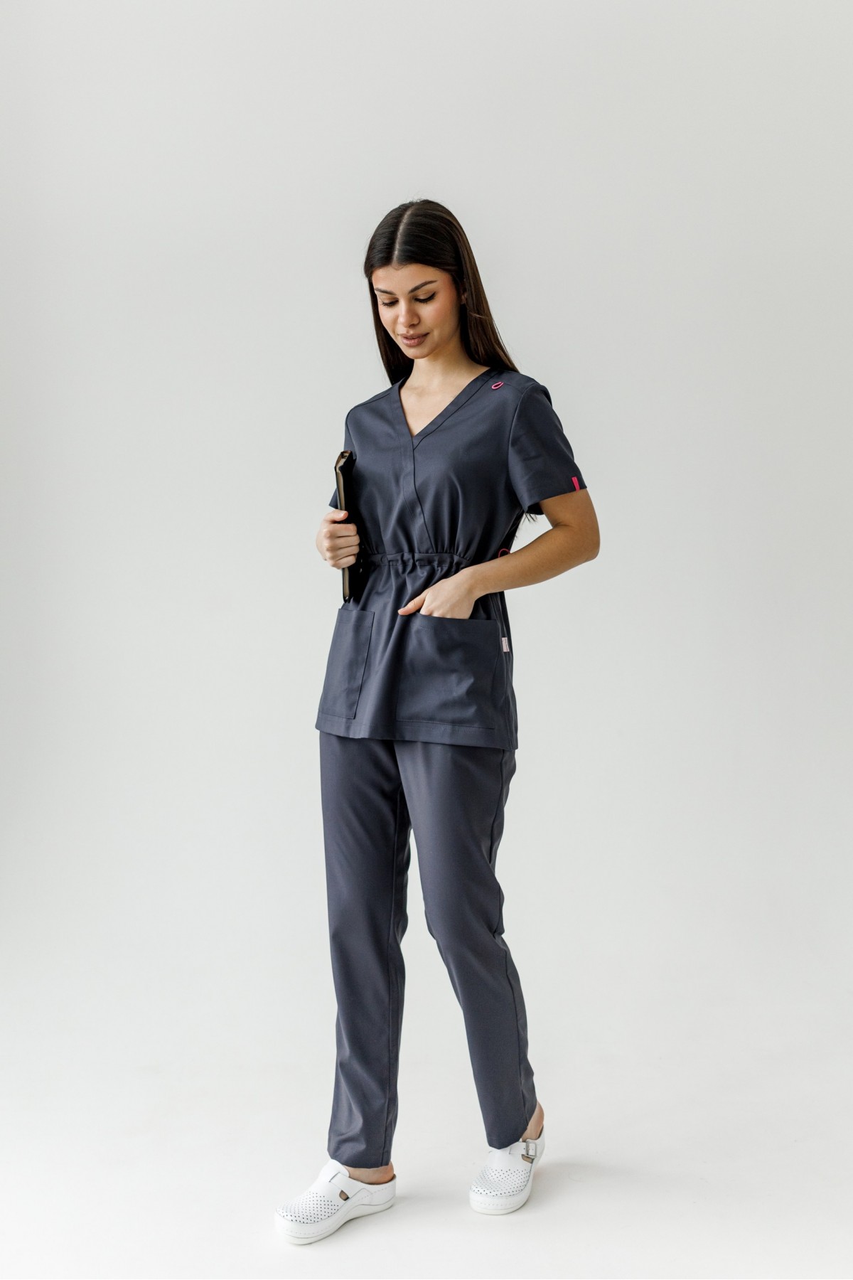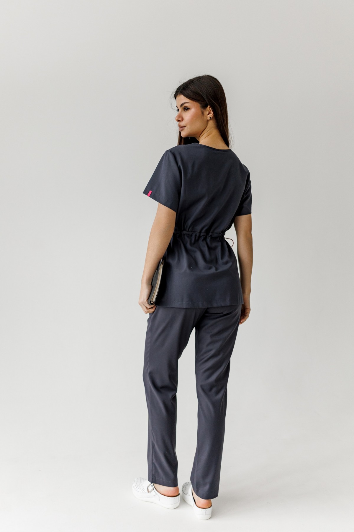 Блуза имеет V-образный вырез , короткий рукав, завышенная талия, которая регулируется резинкой с фиксатором ,имеет декоративные элементы на рукавах. Брюки прямого кроя с внутренними карманами.